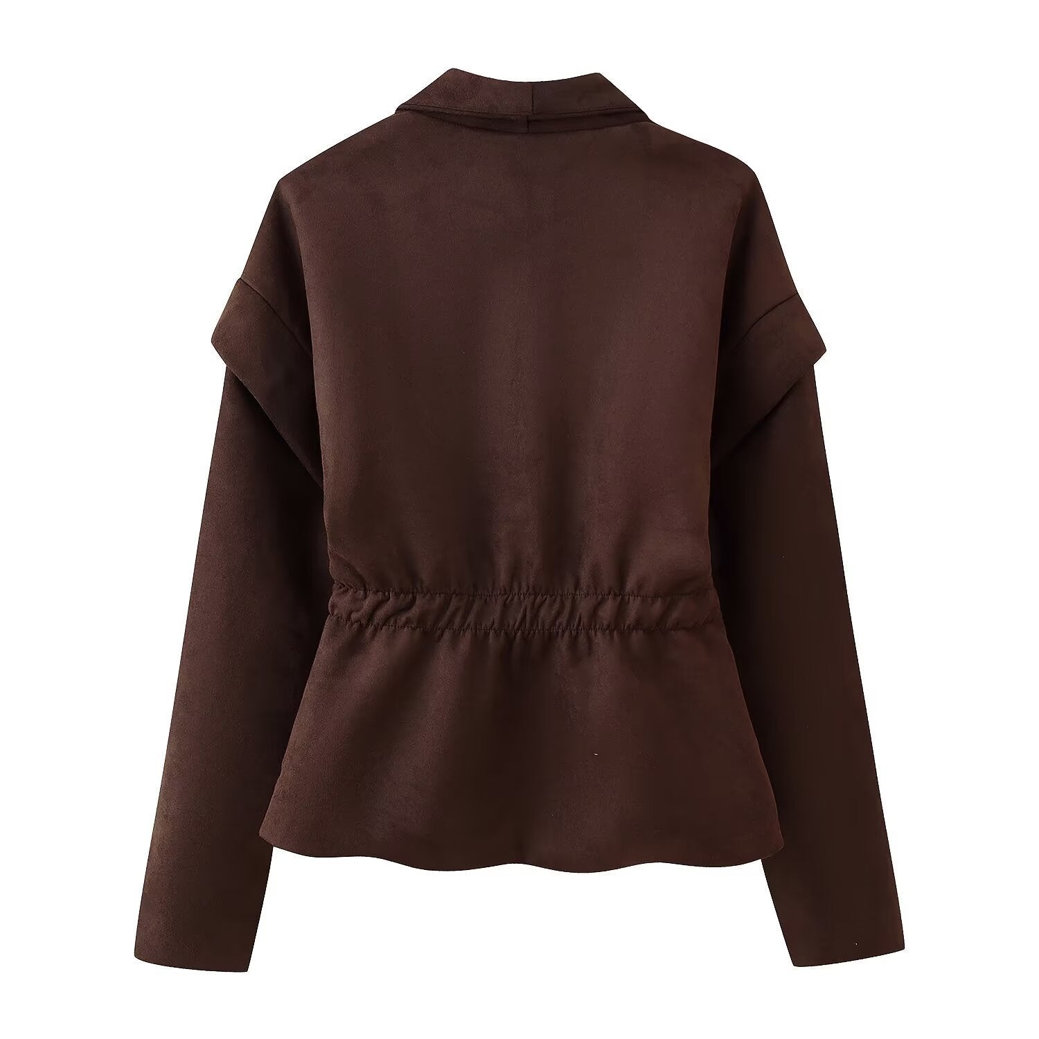 Jacke mit asymmetrischer Vorderseite und einem mittig platzierten Knopfverschluss. Breiter, weich fallender Kragen und taillenkurzer Schnitt mit abgerundeter Vorderkante. Lange, gerade Ärmel und doppelte Schulterpartie durch aufliegende Stofflage. Zwei aufgesetzte Taschen mit abgeschrägter Öffnung im unteren Frontbereich. Das Außenmaterial zeigt eine samtige Struktur, das sichtbare Innenfutter ist glatt.