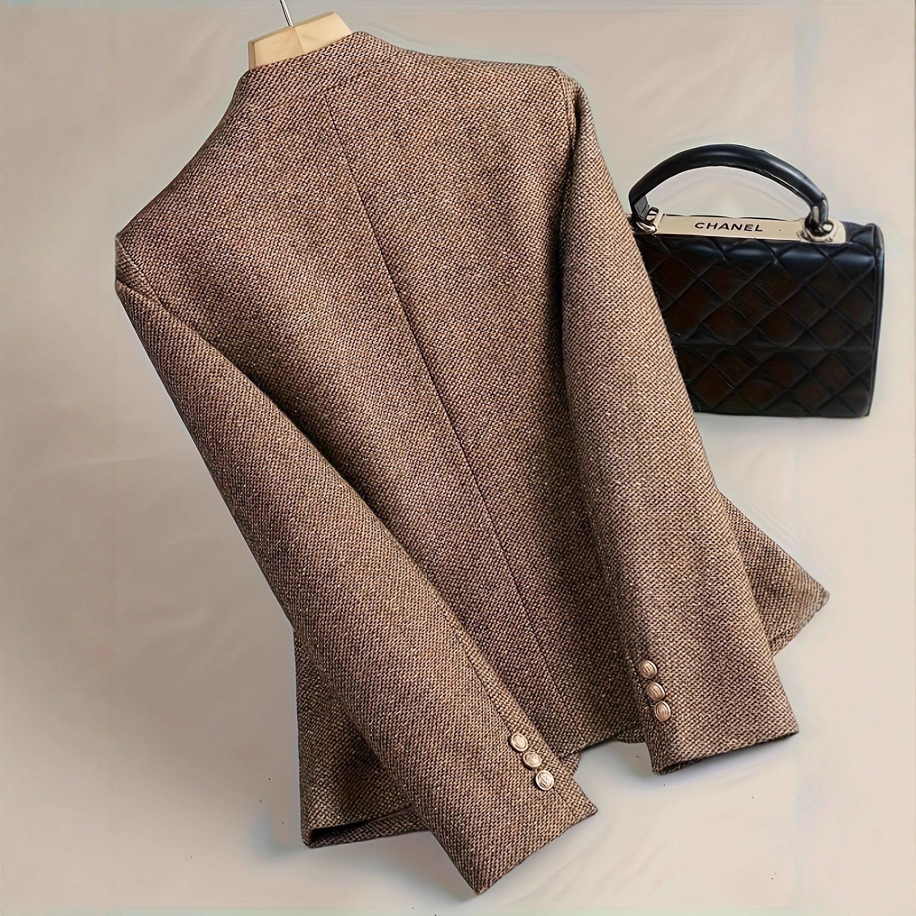 Tailliertes Jackett mit tiefem V-Ausschnitt und ohne sichtbaren Kragen. Verschluss durch zwei kleine Knöpfe vorne, zusätzliche Zierknöpfe an den Ärmelenden. Die strukturierte Oberfläche zeigt ein feines, diagonales Muster. Paspelierte Taschen auf beiden Seiten des Vorderteils und eine textile Blütenapplikation auf der linken Brustseite. Teilungsnähte betonen die Taille und der Saum ist leicht abgerundet.
